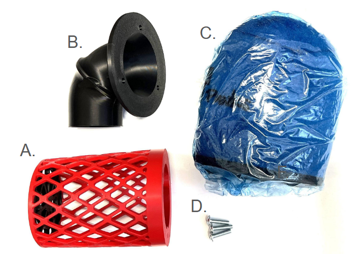 basket, elbow pipe, pre-oiled foam filter, 3× screws.
