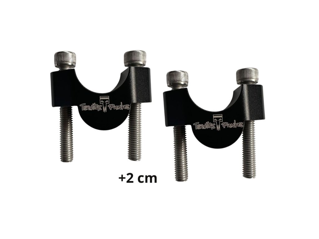 Handlebar extensions/set to raise handlebars by 20 mm for 450MT series bikes. They allow you to maintain a more upright body position, which can reduce fatigue on longer rides. Changing the handlebar height can improve motorcycle control, especially when riding in city traffic or on winding roads. Another benefit is the reduction of pressure on the wrists. Higher handlebars are especially appreciated by off-road bikers.
