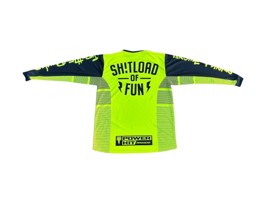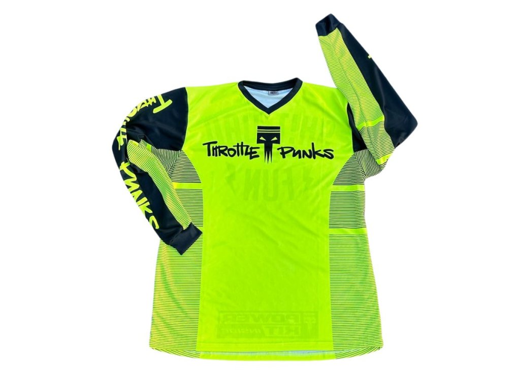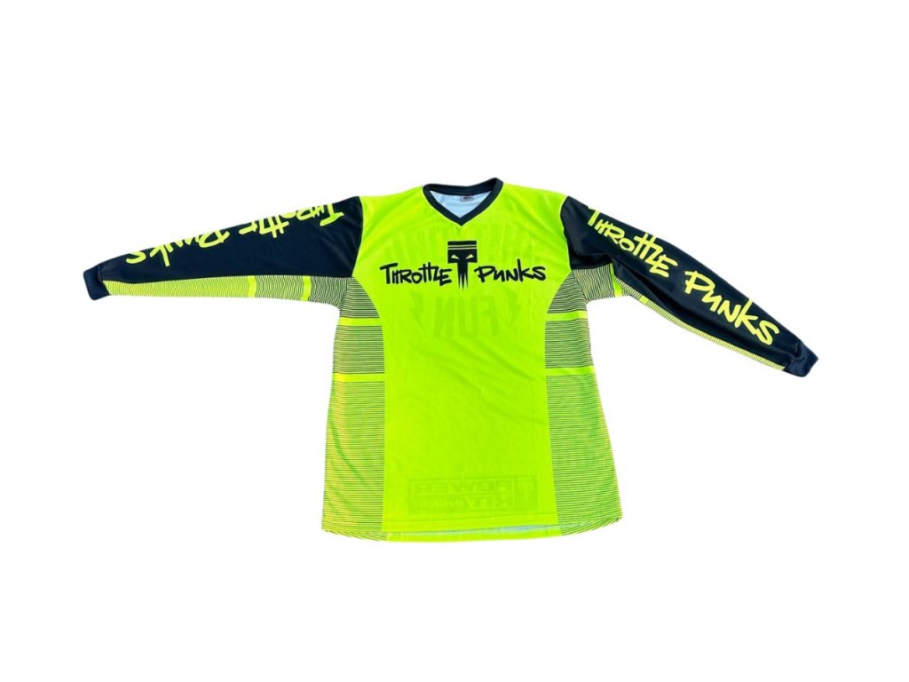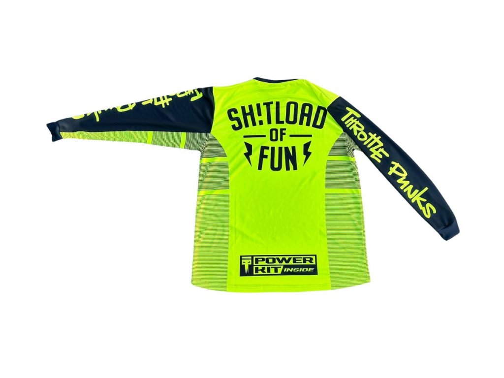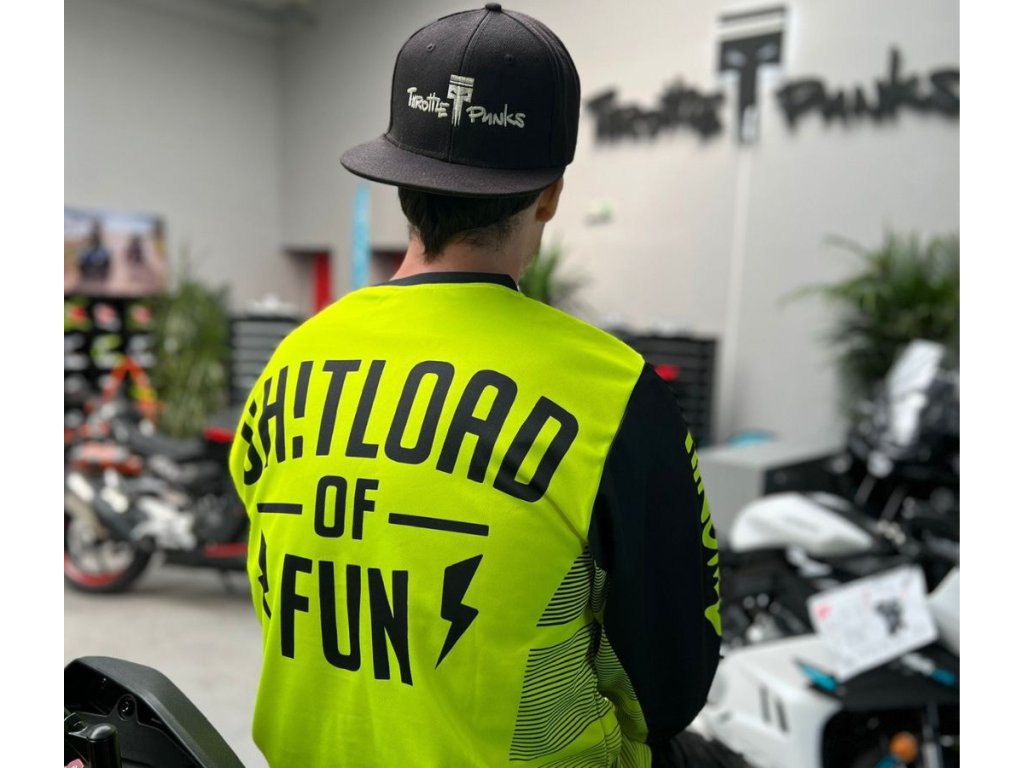 Throttle Punks Motorcycle Jersey Sh!tload of Fun. Be seen and leave no doubt that you’re always going full throttle! Our new Throttle Punks jersey makes you stand out from the crowd with its striking neon reflective color that nobody can miss – whether on the track or out riding with your crew.