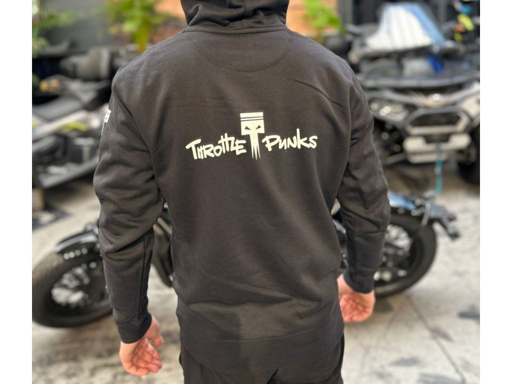 Na zádech značka Throttle Punks, protože crew je všechno. Buď jedete s náma, nebo jedete za náma. Tahle mikina je stejně univerzální jako náš kit – pohodlná na dlouhej trip, odolná pro garážový šichty a stylová na večerní chill s partou.