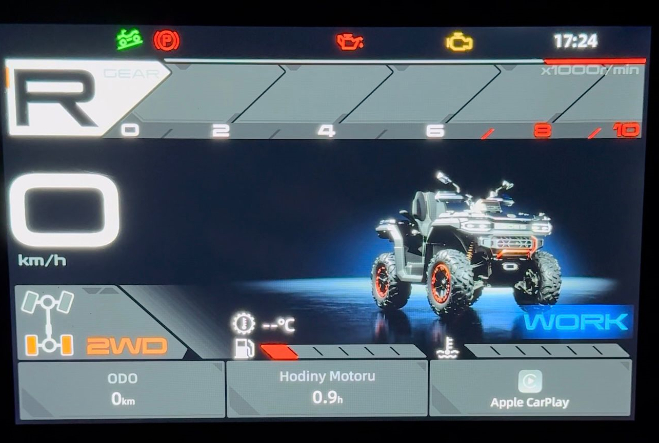 Displej? Velké TFT, čitelné a s připojením na mobil a Carplay je prostě... boží. Už jen po otočením klíčku na vás vyjede krásně propracované úvodní video. navíc . A hlavně – tři jízdní režimy (normal, sport a work), které opravdu mění chování motoru. Žádný placebo tlačítka. Režim Work motor uklidní natolik, že se nemusíte bát, že vás neopatrný pohyb palce vystřelí do šípkovýho keře. Režim Sport je druhá strana mince – čtyřkolka se změní na divočáka. Rozhodně stojí za to vyzkoušet, rezervaci můžete provést online ZDE.