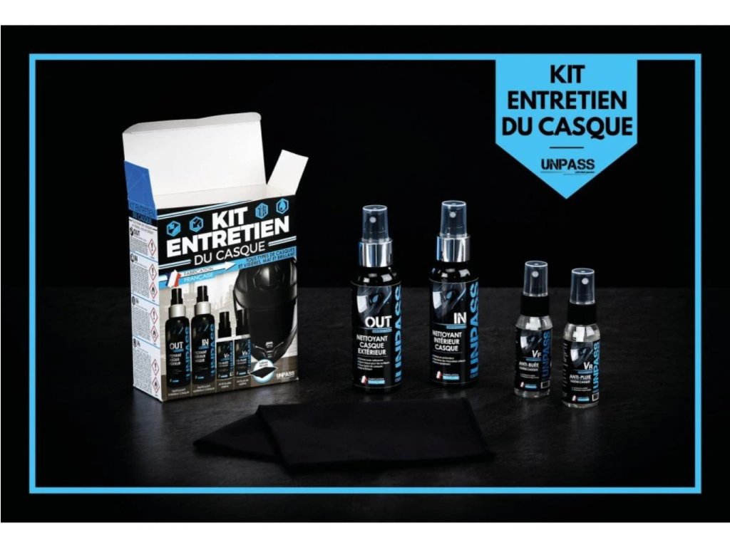 Sada na čištění a péči o helmu UNPASS obsahuje 4 produkty na kompletní čištění a profesionální péči o helmu. Čistí, leští, obnovuje vzhled, odstraňuje nepříjemné pachy, vytváří průhledný film, který zabraňuje zamlžení a vytváří vodoodpudivý film, který zajistí lepší viditelnost za deště.